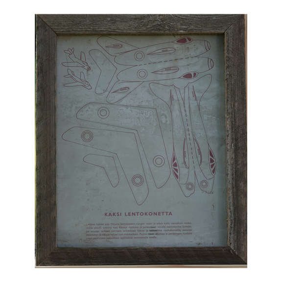 Tämä lentokone taulu on täynnä historiaa ja käsityön lämpöä. Se on valmistettu offsetpainatuksessa käytetystä painopellistä sekä vanhasta askolalaisesta ladonlaudasta, joilla molemmilla on takanaan pitkä ja kiehtova tarina.